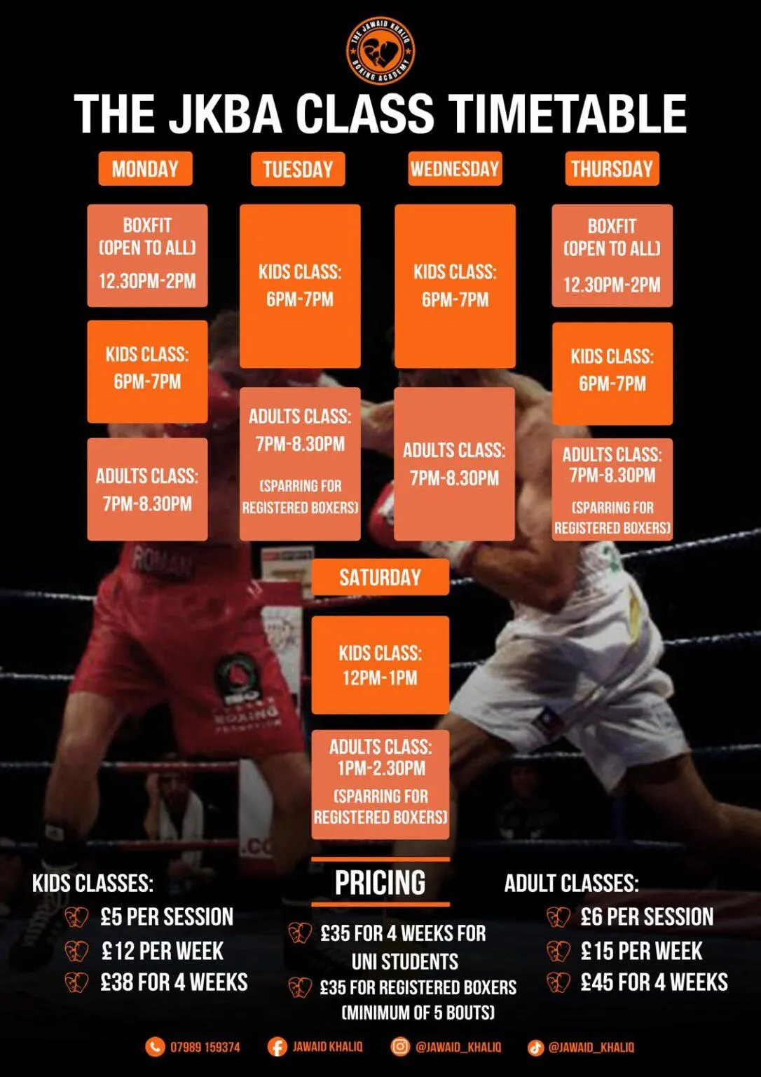 The JKBA Class Timetable & Price List presents a clear and structured overview of all training sessions and associated costs offered by the JKBA boxing academy, designed to help members easily understand the full weekly schedule along with flexible pricing options for both kids and adults. It highlights each class time across different days, ensuring convenience and accessibility for all skill levels, from beginners to advanced boxers, while also providing transparent pricing packages tailored to individual needs, including per-session, weekly, and multi-week options. This combination of detailed scheduling and straightforward pricing reflects JKBA’s commitment to professionalism, clarity, and making high-quality boxing training accessible to everyone in a clean and organized format.